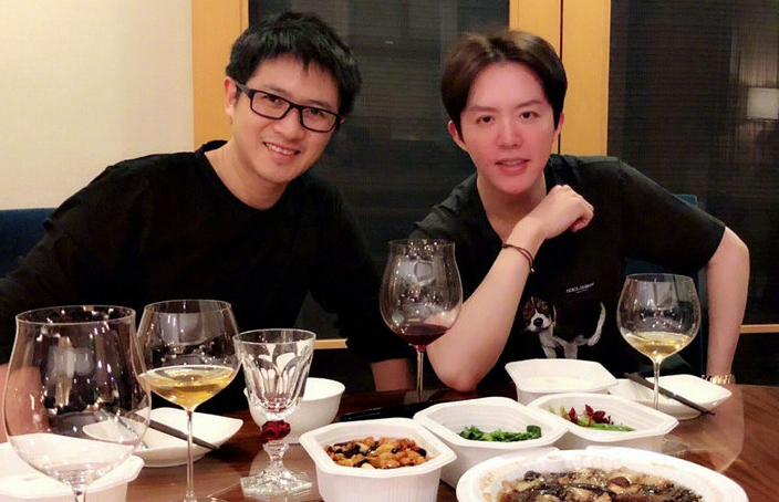 只见照片中两人都穿着黑色T恤,面前的桌上摆了菜和酒,脸上都洋溢着笑容,应该是兄弟的小聚会。