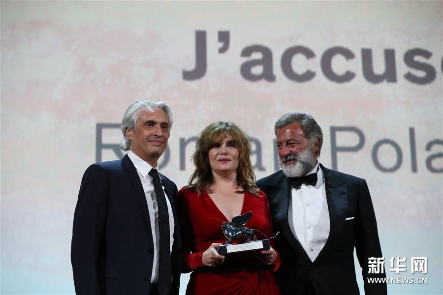 9月7日,在意大利威尼斯,演员埃玛纽埃勒·塞涅(中)代导演罗曼·波兰斯基在颁奖典礼上领奖。新华社记者 程婷婷 摄