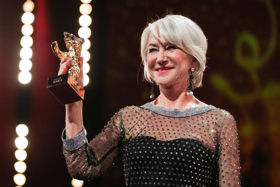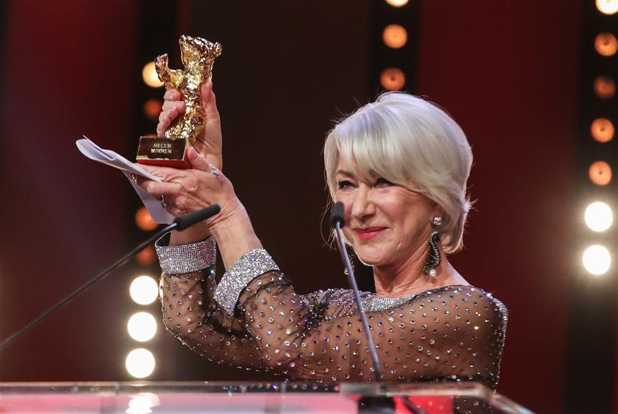 2月27日,在德国首都柏林,英国演员海伦·米伦在颁奖仪式上捧起奖杯。
