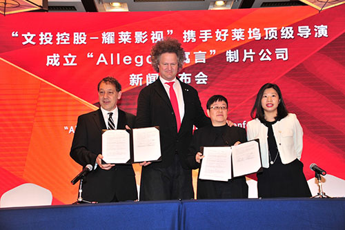搜狐娱乐讯 4月7日刚在上海证券交易所完成更名仪式的文投控股近日传来完成更名后的第一个大动作,通过旗下耀莱影视与好莱坞顶级导演共同成立名为“Allegory(寓言)”的好莱坞制片公司,双方于4月19日在北京国际电影节主会场之一的北京国际饭店举行了新闻发布会和MOU签字仪式.