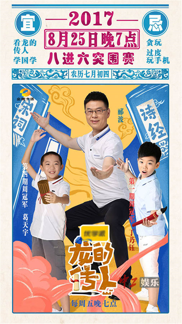 中工娱乐2017年8月25日报道 这个暑假国学文化类节目大热,其中,金鹰卡通卫视全国首档亲子国学传承节目《龙的传人》首当其冲。本周五晚7点,《龙的传人》周冠军集结,争夺最终6个总决赛入场券。据悉,8进6冠军突围赛赛制升级,上演最强学霸对抗赛;“小王迅”和“小林更新”同组PK,撒贝宁疯狂打call。8位周冠军究竟谁能突围总决赛?让我们拭目以待。