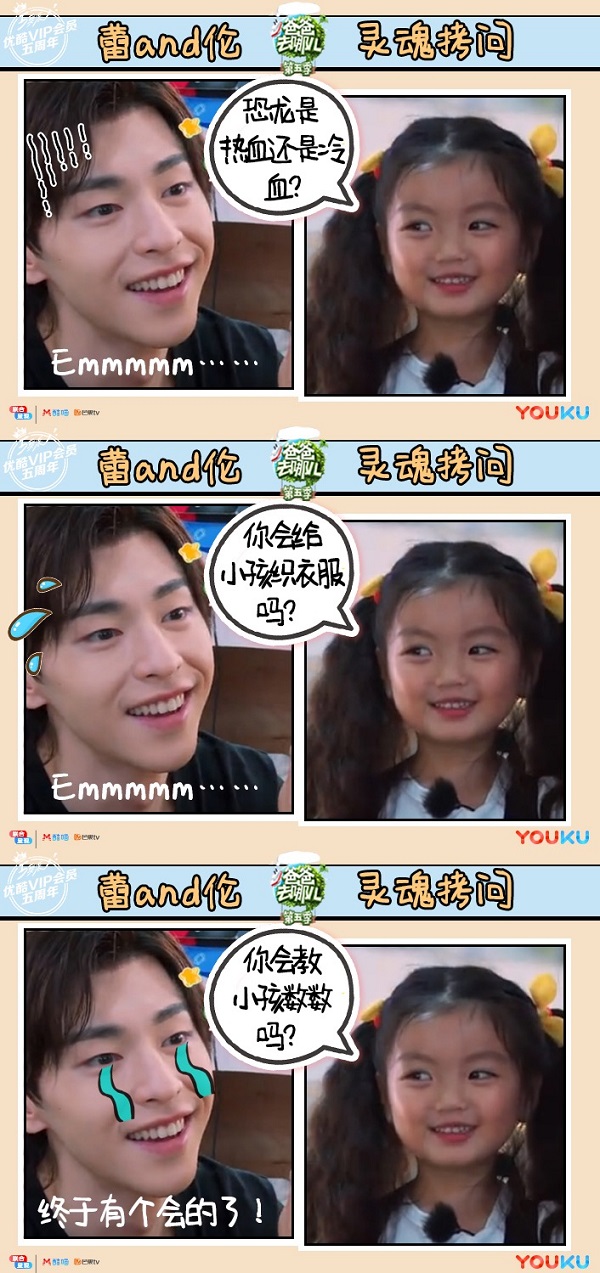最后是本季实习爸爸邓伦,在见到自己的“女儿”之前,为了证明自己是个合格的实习爸爸,他接受了另一个宝宝——阿拉蕾的测试。不过“恐龙是冷血动物还是热血动物?”、“会不会给宝宝织衣服?”、“你会给教小孩数数吗?”这种问题,是认真的吗?但是不是个合格的爸爸还是得从实际行动上看,细心又温柔的邓伦在相处中已经把阿拉蕾暖化了。然而其他爸爸对实习爸爸的未来表示深深的担忧,因为带孩子的痛苦,只有真正当过爹的人才会懂……