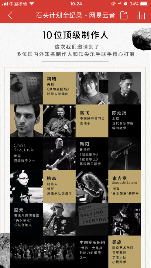 今年2月,网易云音乐启动原创作品征集活动,共收集到2000多首原创音乐作品,然后挑选出49首最优质原创作品,并邀请到10位国内外知名制作人、顶尖乐手联手精心打磨,才有如今这些好听的音乐。纪录片中,很多音乐人都表示,这些专业的制作人和乐手在如何做音乐方面教会了他们很多,甚至“每一句都会帮我抠一些细节”,他们对音乐的坚持与热爱,也令人敬佩。