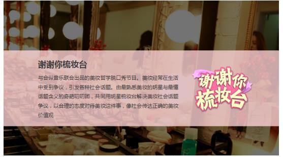 《谢谢你梳妆台》:与合纵音乐联合出品的美妆哲学脱口秀节目。美妆经常在生活中受到争议,引发各种社会话题。由最熟悉美妆的明星与最懂话题含义的奇葩叨叨团,共同用明星梳妆台解决美妆社会话题争议,以合理的态度对待美妆这件事。像社会传达正确的美妆价值观。