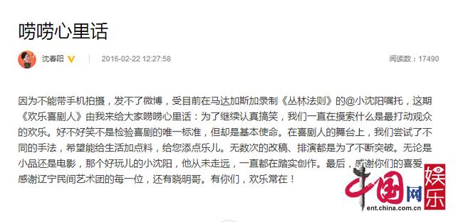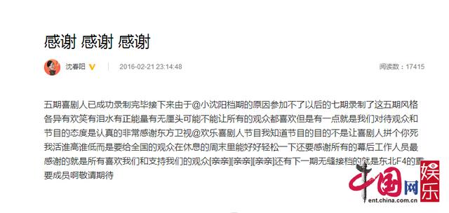 中国网娱乐2月23日讯 近日,小沈阳妻子沈春阳连续发布两篇微博,表示“五期喜剧人已成功录制完毕,接下来由于小沈阳档期的原因,参加不了以后的七期录制了”,间接宣布小沈阳退出《欢乐喜剧人》。消息一出,不少网友表示不解,毕竟小沈阳在参赛初期就曾表达过“想在《喜剧人》找回当年自己曾经在喜剧舞台上的状态”。但比赛还未过半,就要退出竞演,让众人对其退赛的真正原因猜测不已。