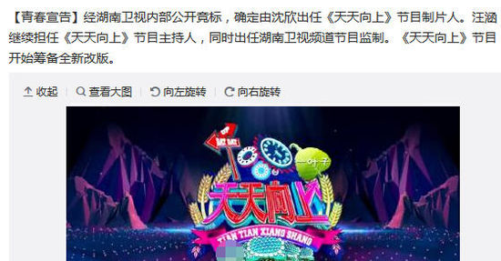 网易娱乐2月25日报道 2月25日下午,湖南卫视官方微博发文称汪涵不再担任《天天向上》节目制片人,改由沈欣出任《天天向上》节目制片人,但汪涵仍继续主持《天天向上》,并称《天天向上》节目开始筹备全新改版。