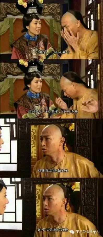 《大太监》里,皇帝因花柳而满脸起了麻子,皇后:“不要紧,一点点麻子,就好像天上的星星多有诗意!”皇上:“以后皇后想看星星,就可以望着朕的脸。”
