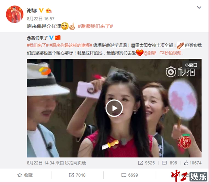此前,《我们来了》官方微博将上周五播出的节目中谢娜的精彩表现剪辑成一个短视频,这段视频一发出,引起网友粉丝的热烈议论,在节目中没有看过瘾的粉丝,都纷纷表示要收藏这个视频。在此条微博下,有一条来自网友“很爱你啊JNJ”的最赞评论:“在任何情况下都有不同的她,但相同的是,任何情况下的她都是善良暖心的,值得我们爱的。”而话题#原来你是这样的谢娜#在短短一天时间便有1936万阅读量,看来太阳女神谢娜的威力真是不可小觑。视频中谢娜不仅用四川话念古诗,腔调十足;还模仿陈乔恩跑步,憨态可掬;在“美食接力赛”中与“车厘子姐妹”江一燕抱作一团,一度发挥“洪荒之力”,让江一燕完全无法有“自主行动力”,网友看到这一幕也是哭笑不得。