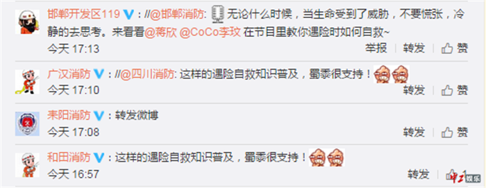 微博视频中,李玟、蒋欣两位将电梯故障、车库遇紧急状况时的救生知识向观众悉数道来,这也是日前湖南卫视《头号惊喜》首播中的节目片段。发博后,中国消防、人民公安、湘西、四川、永州等全国各地共计66家消防系统官微立刻进行了评论以及转发,四川消防更为大赞“这样的遇险自救知识普及,“蜀黍”表示很支持!”为何一条视频竟有如此效果?其实,这正和消防系统对新时代科普救生安全知识的需求有关。相对于传统生硬的救生知识科普方式,《头号惊喜》可谓迈出了备受年轻人喜爱的新一步。首播节目中,“有颜值有智慧”的蒋欣、李玟在毫不知情的情况下面对由何炅、王嘉尔、魏大勋组成的“惊喜别动队”制造的惊喜,被困在故障电梯、或是异常车库中的她们虽然略感紧张,却始终保持冷静运用救生知识自救,更在保证安全的情况下尽可能帮助身边陌生人。全程不仅紧张有趣,同时还潜移默化的将救生科普知识传递给观众,不仅俘获了大量年轻观众的心,还增加了节目的趣味性。有网友评论“算是学到了,以后碰上这种情况,知道自己该怎么做了,真心受教了!”