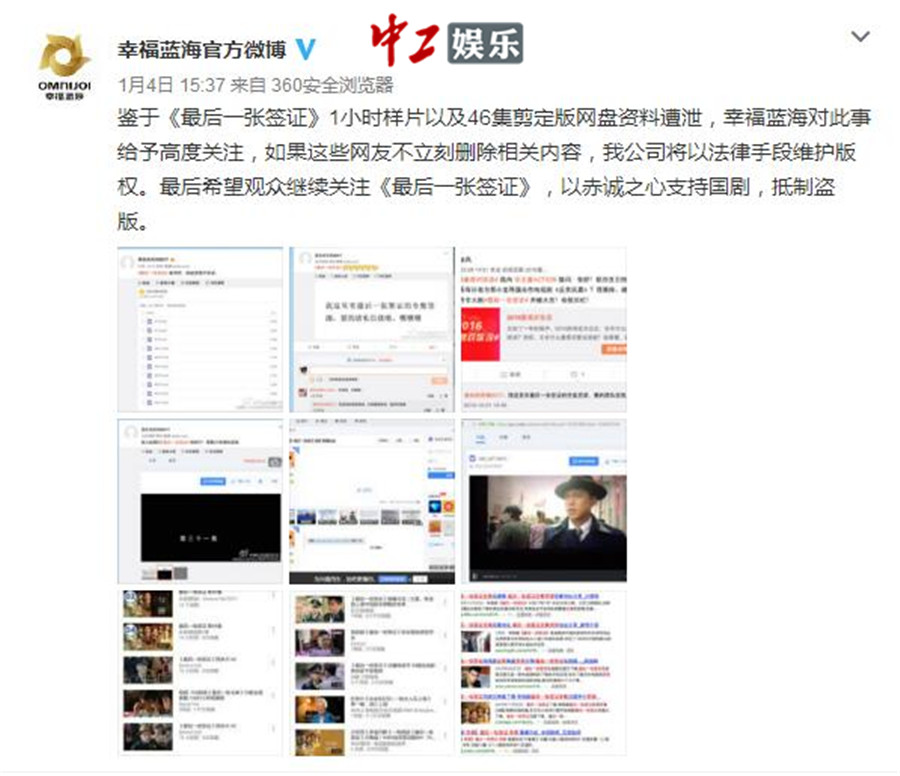 盗版对于电视台的收视率、视频网站点击率的分流,是播出方最不愿意看到的。因此,针对《最后一张签证》片源在网络上疑似遭泄露一事,记者也第一时间致电了电视剧制作公司。该剧制片人回应称,剧方得知消息后已经第一时间启动应急预案,联系相关责任方尽快删除盗版片源,消除不良影响,通过官方微博表态:“鉴于《最后一张签证》1小时样片以及46集剪定版网盘资料遭泄,幸福蓝海对此事给予高度关注,如果这些网友不立刻删除相关内容,我公司将以法律手段维护版权。最后希望观众继续关注《最后一张签证》,以赤诚之心支持国剧,抵制盗版。”而作为播出平台方的江苏卫视方面发出声明表示:“希望个别网友切勿上传、传播此类文件,或以’全集视频泄露’等虚假消息欺骗大众”。