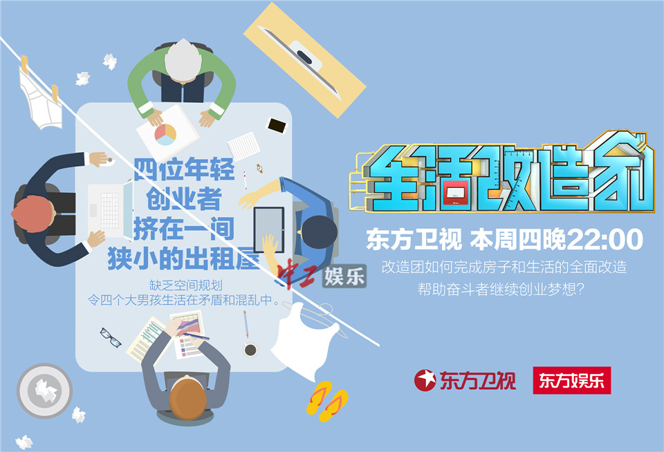 中工娱乐2017年5月25日报道 东方卫视《生活改造家》即将迎来一组90后委托人,四个从事影视行业的大男生希望节目组改造他们目前合租的工作室兼住房。然而,他们的生活状态却震惊了体验团,脏乱的房间里衣服袜子随处可见,还弥漫着奇怪的味道……节目组一致认为,比起改造房子,教会他们如何在日夜连轴的工作中学会生活更重要,而这也正是《生活改造家》的强项。且看本周四22:00,东方卫视关《生活改造家》如何拯救“电视民工”。