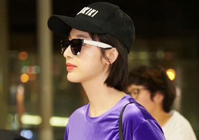 张俪最新机场照中,同样一身紫色运动套装,短上衣搭运动裤显小心机,脚蹬小白鞋,棒球帽短发简单又随性。