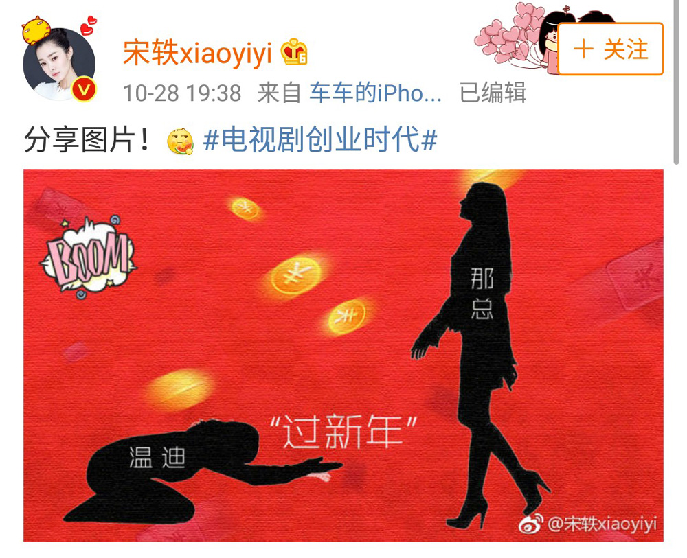由安建执导,张挺编剧,黄轩、杨颖、周一围、宋轶主演的都市情感大剧《创业时代》现已播出过半,不仅获得了颇高的关注度,也不乏许多网友针对角色及剧情的“吐槽”。上周剧集中,由宋轶饰演的温迪在深夜给郭鑫年讲述了“血豆腐”的故事,面对个别网友的恶毒言论,宋轶霸气“下场”回应,“讨厌温迪”和“宋轶 回怼”也轮流登上热搜榜首。在近期的微博中,宋轶也发布了一张搞笑配图来调侃做演员的无奈,只好自黑剧情求“自保”。