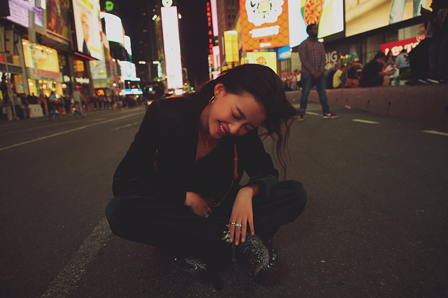 近日,孙怡曝光一组街拍大片。一身绿丝绒西装搭配水晶鞋,长发自然微卷随意披肩,置身于午夜热闹的都市街头,化身行走的时髦精。