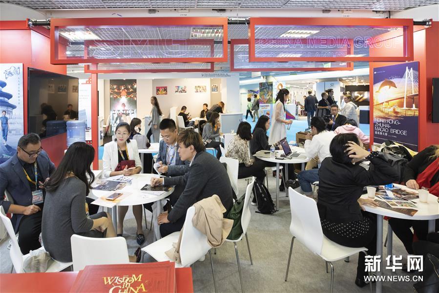 10月15日,在法国戛纳2019秋季电视节上,中国联合展台前人头攒动。新华社发(法布里斯·桑佩尔摄)
