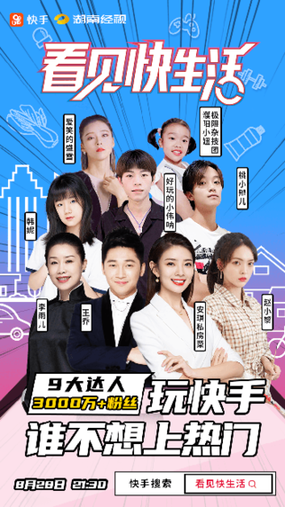 8月28日21:30,《看见快生活》节目将准时开播。据了解,《看见快生活》是由快手科技与湖南经视联手打造,自8月28日起每周播出一期,在湖南经视的电视大屏和快手节目账号同步直播。节目中将播放快手短视频精彩集锦,解锁每周新鲜热点,带领观众看见有趣生活的同时,主持人还会连麦多位快手达人进行互动,邀请达人们才艺展示,直播有趣故事。