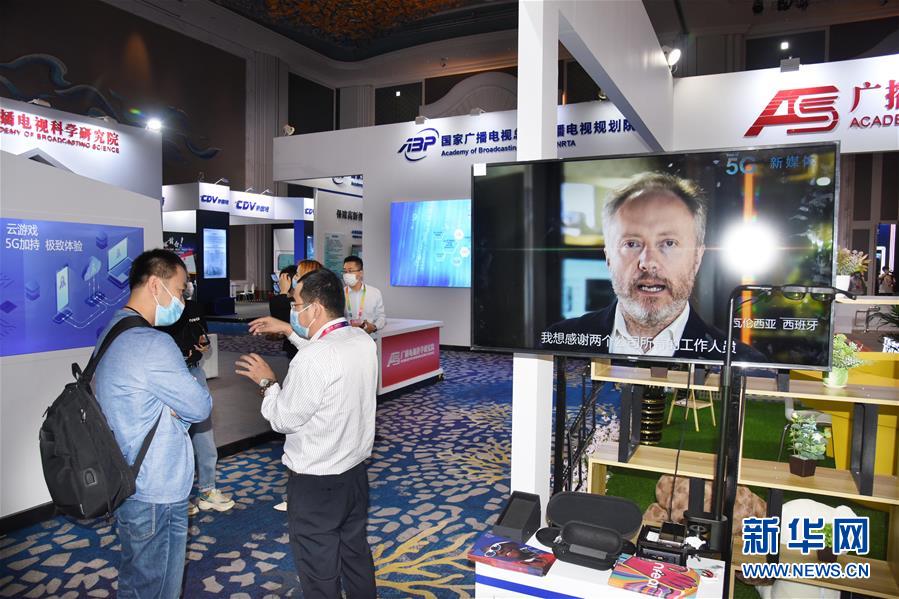 9月26日,参观者在展会上了解5G高新视频技术。 当日,以“梦圆小康·光影同行”为主题的2020青岛影视博览会在青岛西海岸新区东方影都开幕。本次博览会采取“线下+线上”相结合的方式进行,期间将举行5G高新视频、影视主题、市场交易、成果发布4个单元15项主题活动。 新华社记者 李紫恒 摄