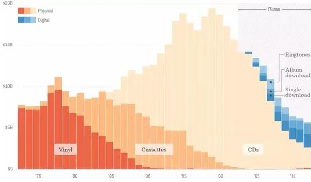 iTunes被认为是“罪魁祸首”。作为乔布斯留下的最杰出成就之一,iTunes在2003年上线之后,改变了一代人的生活方式,也毁掉了一个传统行业。2013年,iTunes上线十周年之际,CNN做了一篇“触目惊心”的报道,标题叫“iTunes如何碾压音乐销售”,报道中给出的图表显示,2004年,iTunes取得收入的同时也正是实体唱片滑坡的开始。(如下图)