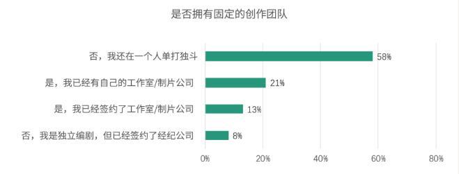 调查数据显示,近六成的受访编剧还处于单打独斗的状态,没有加入经纪公司、制片公司或是编剧工作室。大多数人平均每年接一到两个剧本项目。