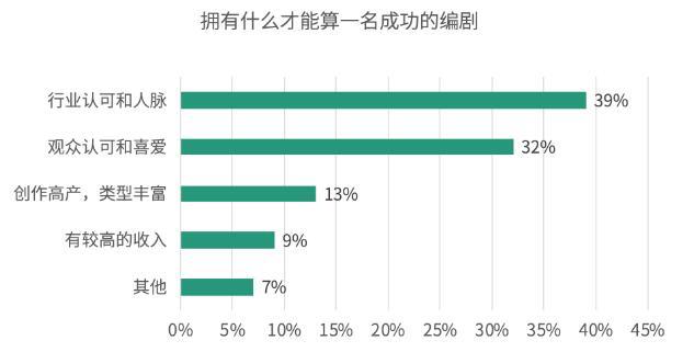报告认为,“收入”在衡量编剧成功标准中被排在了后位。对于青年编剧来说,获得业内外的认可才是他们目前最为迫切需求。