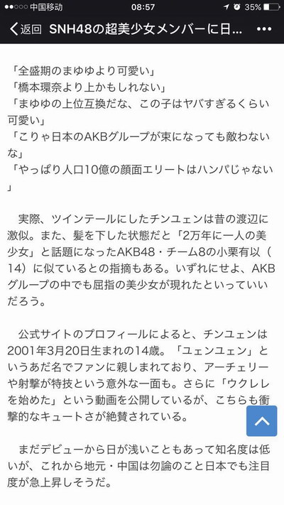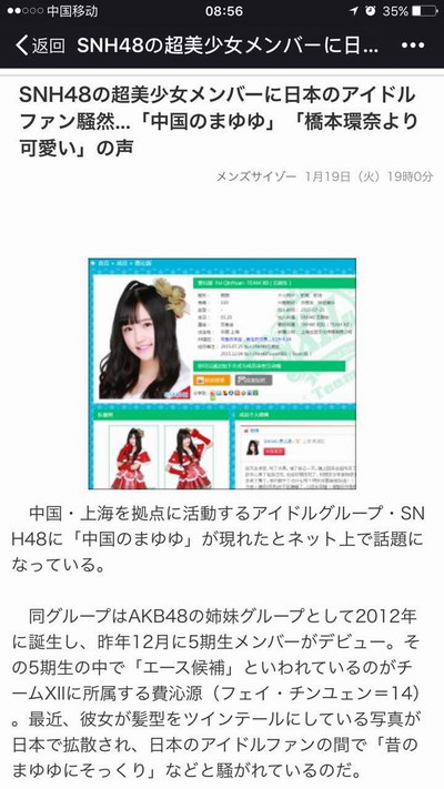 据日本网站报道,中国女子偶像组合SNH48于2012年诞生,去年12月五期生成员出道。在这五期生当中有“Ace候补”之称、所属Team XII的费沁源。最近,她双马尾发型的照片在日本传播开,日本的偶像粉丝间骚动起来,惊呼“简直就是曾经的麻友友(渡边麻友)”,更被日本门户网站称之为“人才宝库”。