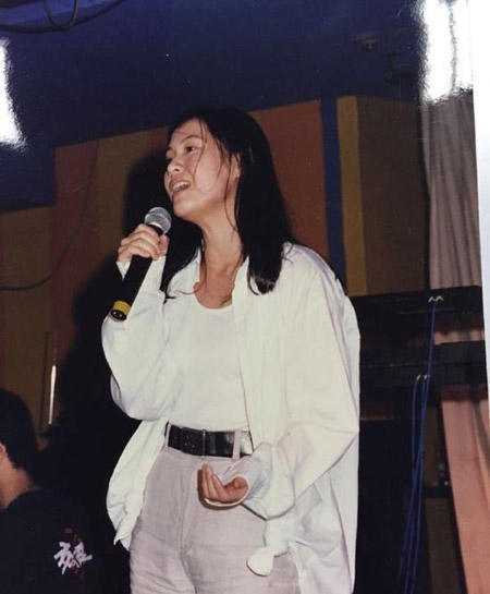 照片中,刘若英留长发,穿白色T恤衫,宽松的白色衬衣套在外面,卡其色长裤束着腰带,模样清纯。她手握话筒倾情献唱,表情十分认真。