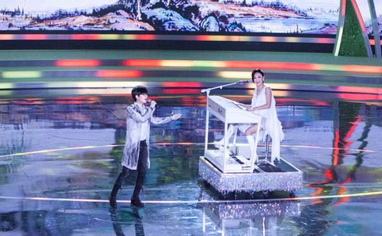 作为中国内地第一器乐演唱组合,玖月奇迹曾数次登上央视舞台,每每亮相总能予观众和乐迷以最大惊喜。晚会当晚,玖月奇迹首先从视觉上就让人眼前一亮,小玮的纯白流苏裙仙气十足,小海的水墨风长衫则与大屏幕上的中国山水相映成趣,两位都与《中国美》的歌曲意境十分契合,这份妙思足见其用心。而更让人惊叹的,是他们在音乐上一如既往呈现给观众的完美舞台,小海的演唱强劲有力,音色高亢,浑厚的唱功震撼现场,京剧式唱白韵味十足;小玮360度旋转式弹奏双排键的一幕惊艳众人,实力再现“天下第一脚”的无双魅力,洒脱灵动的歌声也是甜美醉人。