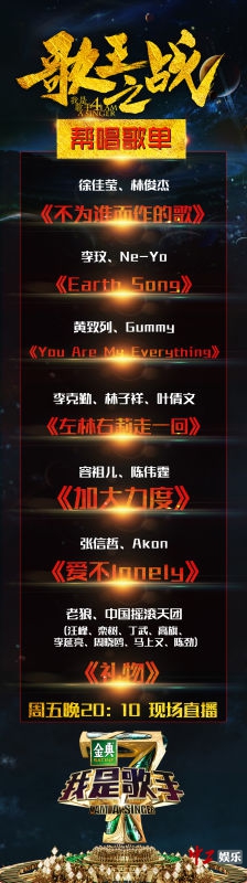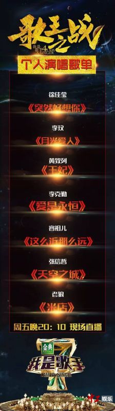 中工娱乐4月8日讯 今晚20:10现场直播《我是歌手4》歌王之战 完整歌单曝光