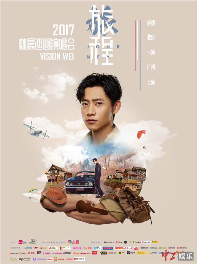 此次曝光的海报依然延续了主视觉海报独特的设计风格,融入多种“旅程”相关元素如滑翔伞、背包、吉他、绅士帽等,呈现着魏晨十年音乐旅程中所遇到的幕幕风景!画面中,魏晨仿佛成为一名时空旅者,双臂怀抱这些被具像化的“十年风景”,认真回顾与审视着不同阶段的自己,色调温和却有十足张力,颇具视觉冲击!出道十年,他纵情燃烧青春,却也始终保持笃定,就如海报中,魏晨也多了一份十年磨练而成的平和与冷静。