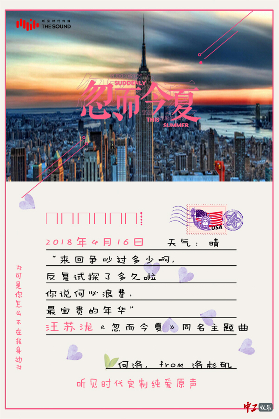 听见时代传媒秉持独特的青春解读与音乐态度,邀请音乐人汪苏泷一起,为青春现实剧集《忽而今夏》追求与描绘故事深处的真挚感情色彩,在继《微微一笑很倾城》、《夏至未至》等大火原声歌曲后,全新升级,一同突破,不断追求打造全新风格。不同作品,一样的感动,与你一起“听见”,时光带不走的那个夏天。