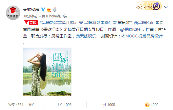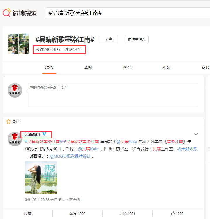 天蜂娱乐 官方微博 新歌预告《墨染江南》话题阅读量24小时达到2463.6万 讨论4478 。