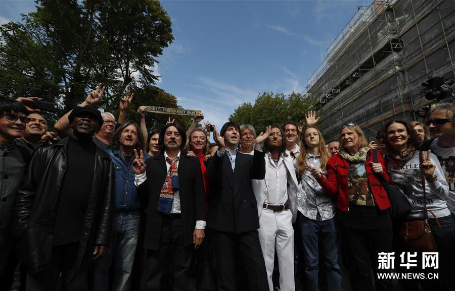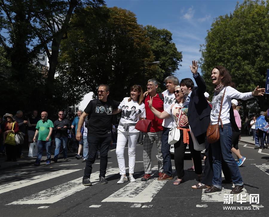 8月8日,在英国伦敦,装扮成披头士乐队的演员与歌迷们在《艾比路》专辑封面照片拍摄地合影。新华社记者 韩岩 摄