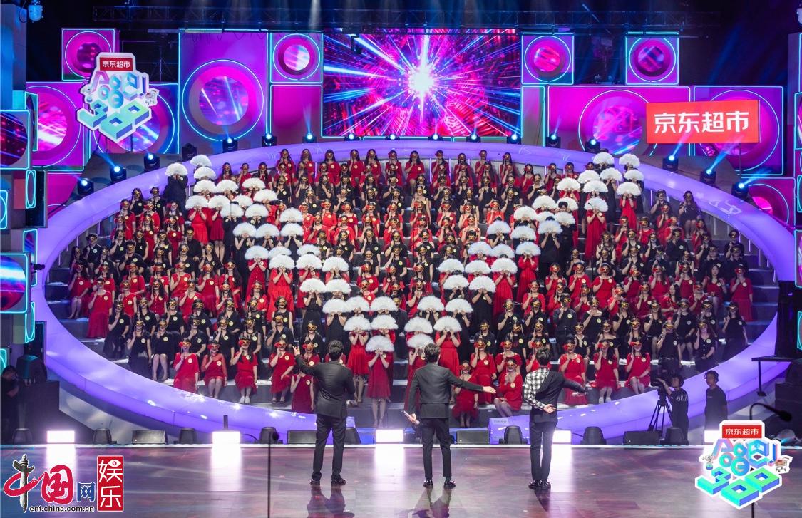 在无彩排创意合唱秀环节,声入人心合唱团选择了一曲《光之心》。他们以探戈舞步,开启华丽合唱篇章,让舞蹈与美声完美融合。合唱中,300合唱达人分饰不同的声部,为台上的声入人心男团和声。而小提琴四重奏、花腔高音的亮相,更为舞台增色不少,让整个表演更像是一场高规格的“歌舞剧”。而火箭少女101合唱团则带来《荣誉星球+卡路里》串烧,点燃了现场的热情。荧光手套、健身哑铃、反光板的设计,让整个秀在创意之余,彰显着属于年轻人的活力。火箭少女101李紫婷在完成舞台后表示,虽然并没有一同彩排过,但却是让自己最有安全感的一次表演。而VIP观众陆思恒也在现场的欢呼声中,被叫到台上以一段即兴版本《卡路里》与火箭少女101Yamy现场battle。