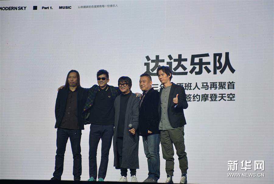 10月30日,摩登天空公司CEO沈黎晖(中)在发布会现场与达达乐队签约后合影。新华社记者 肖潇 摄