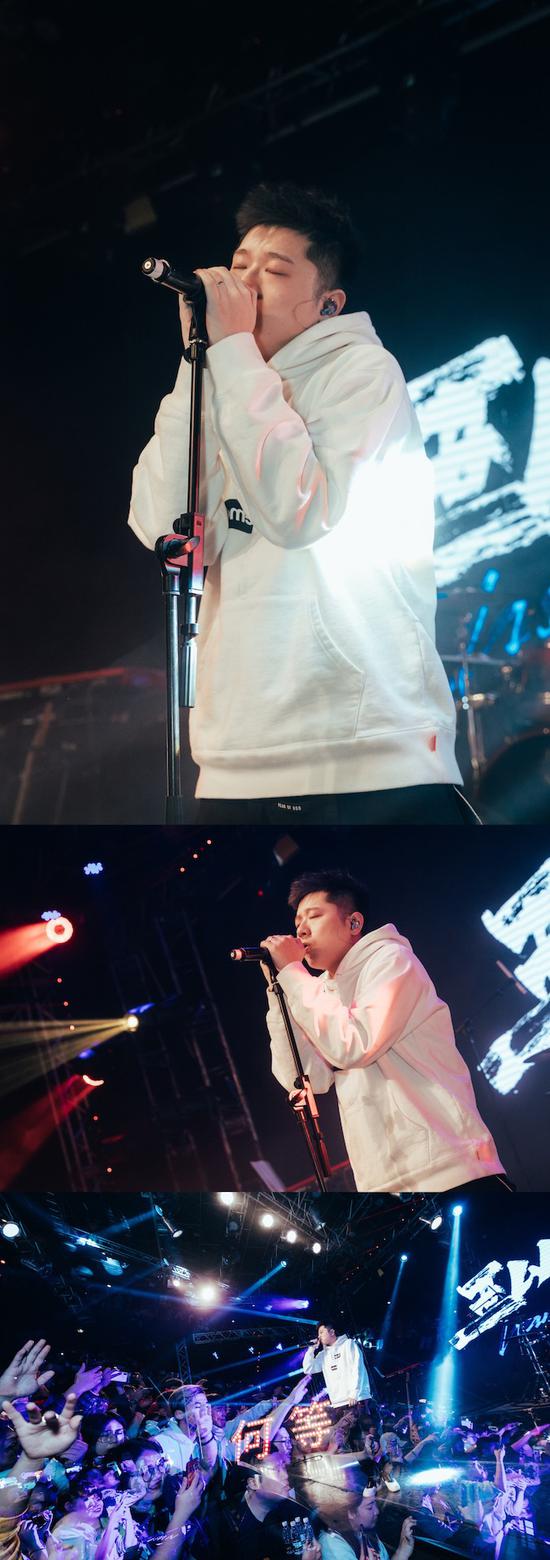 演出开始,好兄弟DK和妻子小帕化身DJ,给大家带来了别出心裁的“燥音电台”开场,两人以搞笑DJ访谈的形式互相打趣,引出一曲躁动感十足的《傻瓜》,那吾和DK将整张专辑里面节奏强劲的两首《傻瓜》+《万众瞩目》精心编排成串烧,现场开燥!而粉丝们在灯光音乐的感染下,所有人双脚离地,用身体的跃动去享受最纯正的HIP-HOP Live!现场气氛“嗨了”!