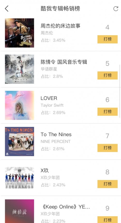 酷我音乐作为杰迷们的“快乐老家”,完整收录了歌曲1130首,专辑59张,首首热评都突破999+,“周式神曲”成为所有铁杆粉丝与乐迷们的快乐源泉。2016年周杰伦发布全新专辑《周杰伦的床边故事》,至今仍霸榜酷我音乐专辑畅销榜总榜TOP4。