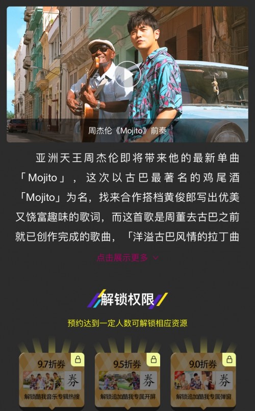 本次新歌《Mojito》,在酷我音乐火爆的预约程度让粉丝也表示意料之中,毕竟每次都在酷我音乐蹲点。同时值得注意的是,在酷我音乐预约即可解锁周杰伦专属迷妹迷弟新歌权限,专辑97折、95折、9折券已备好,同时还可为本次新歌解锁专辑热搜、酷我专属开屏、弹窗等宣推。