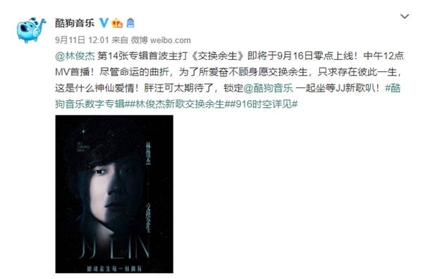 原标题:林俊杰全新单曲《交换余生》上线酷狗 放弃一切只为找回所爱的人从9月3日起,JJ林俊杰就不遗余力地在社交平台预告自己的全新单曲《交换余生》即将面世的消息,让歌迷们期待值爆表。9月16日零点,JJ林俊杰全新单曲《交换余生》千呼万唤始出来,酷狗音乐也零时差上线《交换余生》正版音源,与全网歌迷一起“接生”。