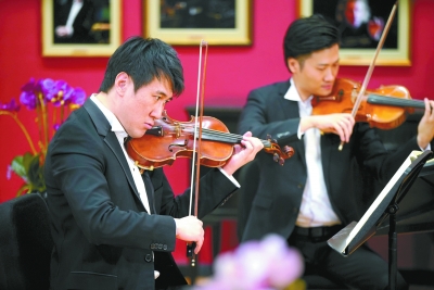 大师会客厅里,粉刷为红色的墙壁上挂着历代音乐巨匠的照片,在他们的静默注视下,贝多芬《c小调第四号弦乐四重奏》的旋律悠悠响起。这一刻,国家大剧院管弦乐团首席李喆和另外三位同事刘弦、庄然、梁肖百感交集。
