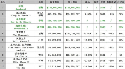 在《死侍》完爆票房之后,另外两部新登场的电影显然被打压。爱情喜剧片《单身指南》表现中规中矩,首映周末只以1875万美元排名第三;更尴尬的是本-斯蒂勒——由其自导自演的喜剧片《超级名模2》,几乎调动了他一切能调动的资源,但这部明星云集的电影,并没有因为凶猛的宣传攻势而为票房增分,首映周末只有1565万美元进账,在票房榜上排名第四。这两部新片的吸引力,都不及梦工厂的动画大片《功夫熊猫3》,影片上映到第三周依旧保持了3844家影院的上映规模,周末以1965万美元位居第二。尽管《功夫熊猫3》从一开始就未能成为一部现象级的电影,但其借助强硬的口碑,还是在市场上显现出了非同寻常的吸钞刚性。影片目前的北美票房为9391万美元,连同海外市场收回的1.62亿美元,这部人见人见的卖萌动画业已在全球范围内赢得2.56亿美元,勉强达到梦工厂的预期。