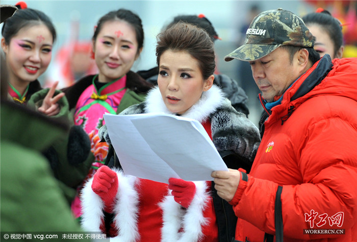 央视主持人朱迅来到西安,参加了分会场的彩排。在南门城墙上,记者看到朱迅穿着厚厚的羽绒服与工作人员一起筹备节目。