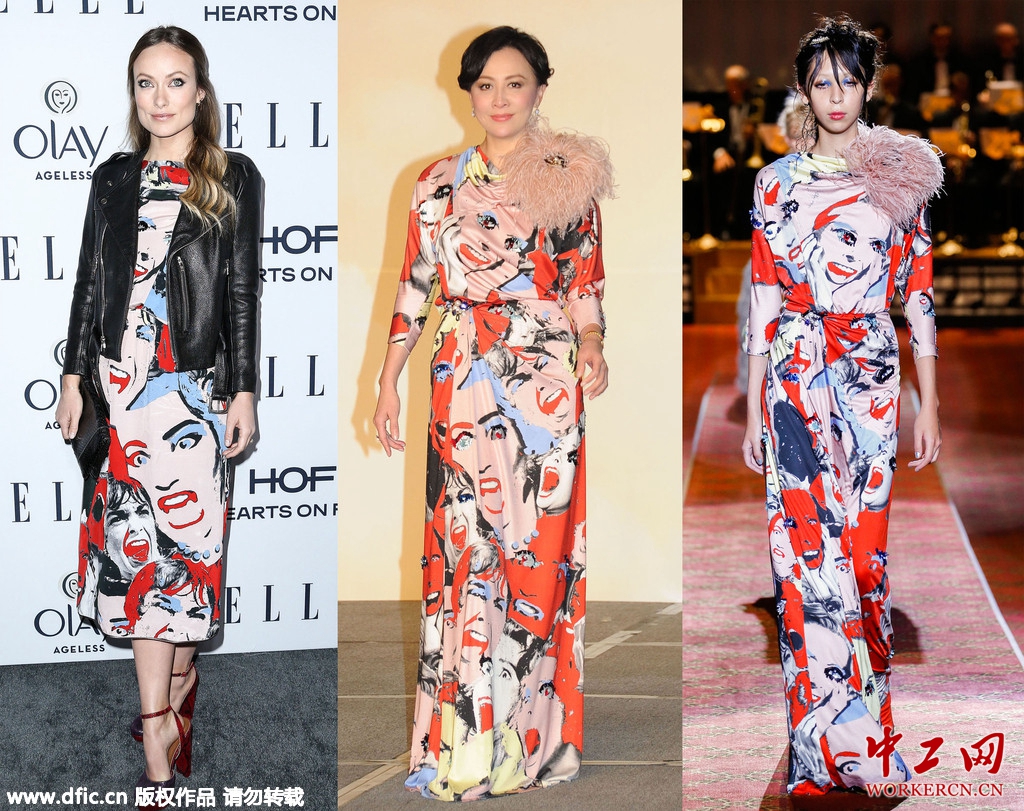 近日,香港,刘嘉玲穿Marc Jacobs人像印花裙出席电影《澳门风云3》首映礼,与奥利维亚-王尔德(Olivia Wilde)撞衫。奥利维亚-王尔德将礼服原本肩部的皮草设计拿掉,改短裙长,外搭皮衣,将原本贵妇气质十足的这件礼服穿的十分亲民。选择皮衣夹克是为了让内搭印花裙不那么张扬,而这件印花裙也可以让黑夹克显得不那么死气沉沉,两者是相得益彰。