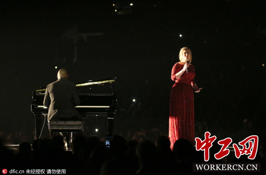 当地时间2016年2月15日,美国洛杉矶,第58届格莱美音乐奖。阿黛尔一袭红裙献唱新歌深情款款。