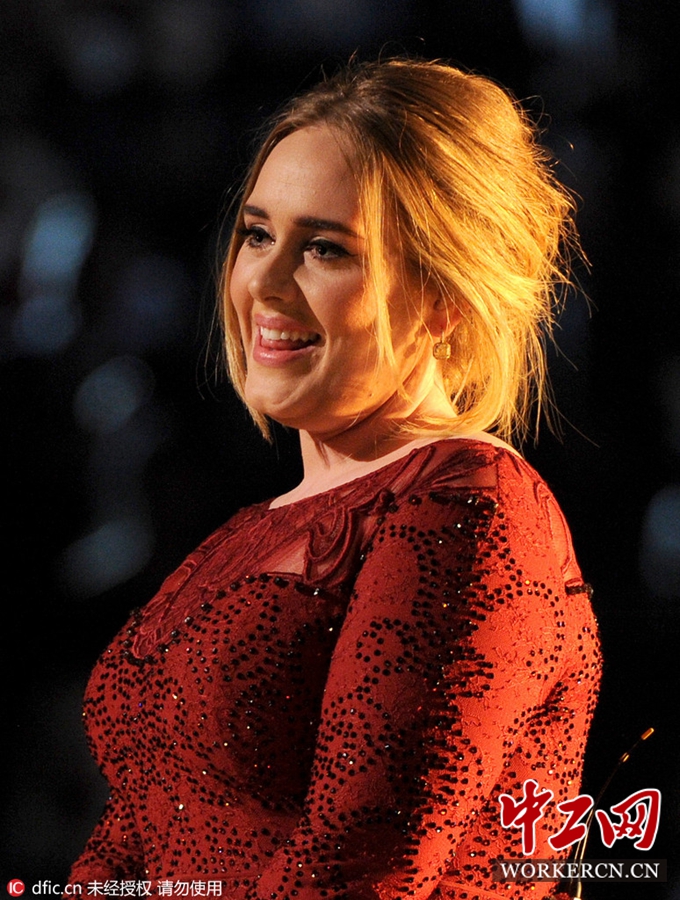 当地时间2016年2月15日,美国洛杉矶,第58届格莱美音乐奖。阿黛尔一袭红裙献唱新歌深情款款。