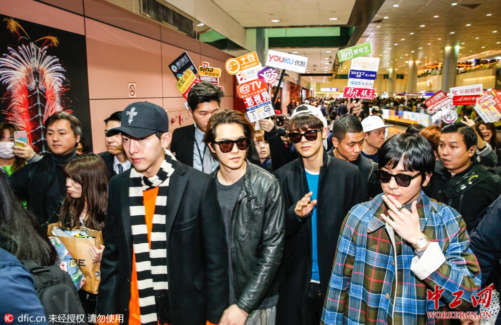 中工网讯 2016年2月18日,台北,CNBlue抵达机场。CNBLUE(全称Code Name BLUE),韩国摇滚乐队,由两位吉他手兼主唱郑容和与李宗泫,一位贝斯手李正信,一位鼓手姜敏赫组成。