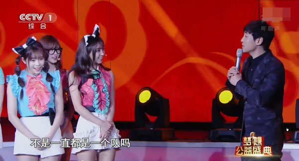 在互动环节中,萌妹子受到“郝建”沈腾的厚爱,频频被求熊抱。成员也非常配合地喊起“沈老师”,一口酥的叫声让经历过春晚这样大场面的沈腾,顿时也是被萌妹子所征服,当场倒地不起。而在表演环节中,SNH48 Team SII成员首度翻唱了少女时代成名曲《GEE》,搭配着SNH48自主潮牌,伴随着律动的旋律,SNH48欢快地跳动,顿时让人眼前一亮。在游戏环节中,凤凰传奇的玲花与SNH48也是颇有渊源,去年《梦想星搭档》一起合唱,今年又和SNH48 Team SII队长戴萌组队,击败了由撒贝宁、沈腾、凤凰传奇曾毅组成的男队,成功为听障儿童捐出善款。