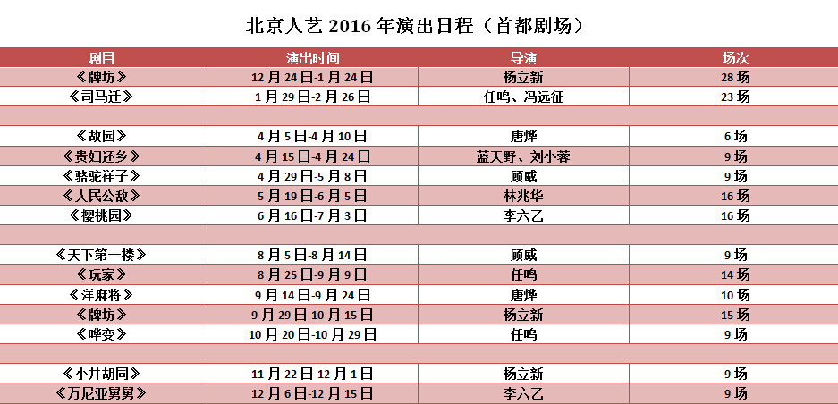 千龙网北京3月1日讯(记者 王立立) 备受关注的人艺“戏单”来啦!!!北京人艺2016全年演出计划今天(3月1日)公布,17部大戏14部小戏包含新排剧目、经典作品,将轮番登台为观众奉上一年的戏剧盛宴。