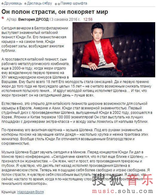 搜狐娱乐讯 开年伊始,当今国际古典乐坛钢琴巨星李云迪全球发行的最新古典大碟《肖邦:叙事曲》火爆上市,行程满档的他也再度成了“空中飞人”,在欧美国家开启的“肖邦传奇”独奏音乐会巡演场场满座,无愧其“国际钢琴巨星”的美誉。继美国洛杉矶的独奏音乐会收获满堂彩后,李云迪在荷兰鹿特丹、白俄罗斯明斯克的演出也取得了巨大的成功,当地民众、华人华侨和主流媒体纷纷对这位从中国走出的当代肖邦最佳诠释者表现出高度关注和最大的热情如“猴赛雷”!