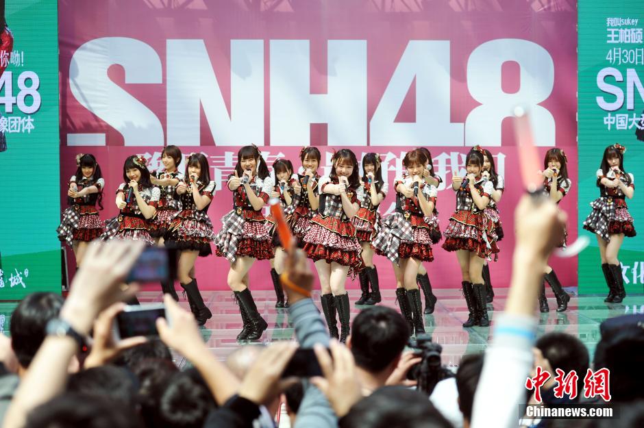 4月30日,辽宁沈阳,中国大型女子偶像团体SNH48部分成员在沈阳中街登台表演,吸引大量粉丝前来助威。 中新社记者 孙昊声 摄