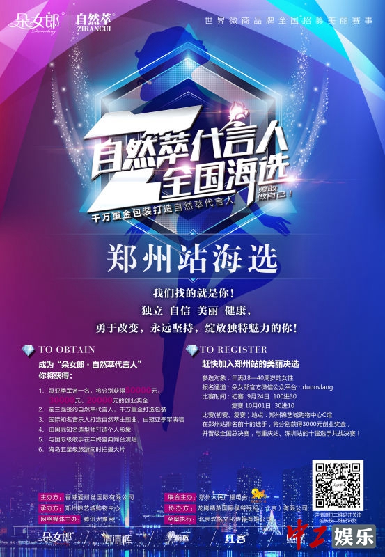 据介绍,郑州站海选是继朵女郎自然萃代言人选拔赛在重庆成功举办后的全国第二站,不管你是卖萌的、文艺的,还是耍宝的、清新的,只要你心怀梦想、热爱生活,并愿意在大舞台上展现自己的激情,下一个朵女郎就是你。如果你年龄在24岁~48岁,都可以通过微信号duonvlang报名参赛。24日,朵女郎郑州站海选将在郑州锦艺城购物中心C馆举行,选手还可以当天在海选现场报名参与。